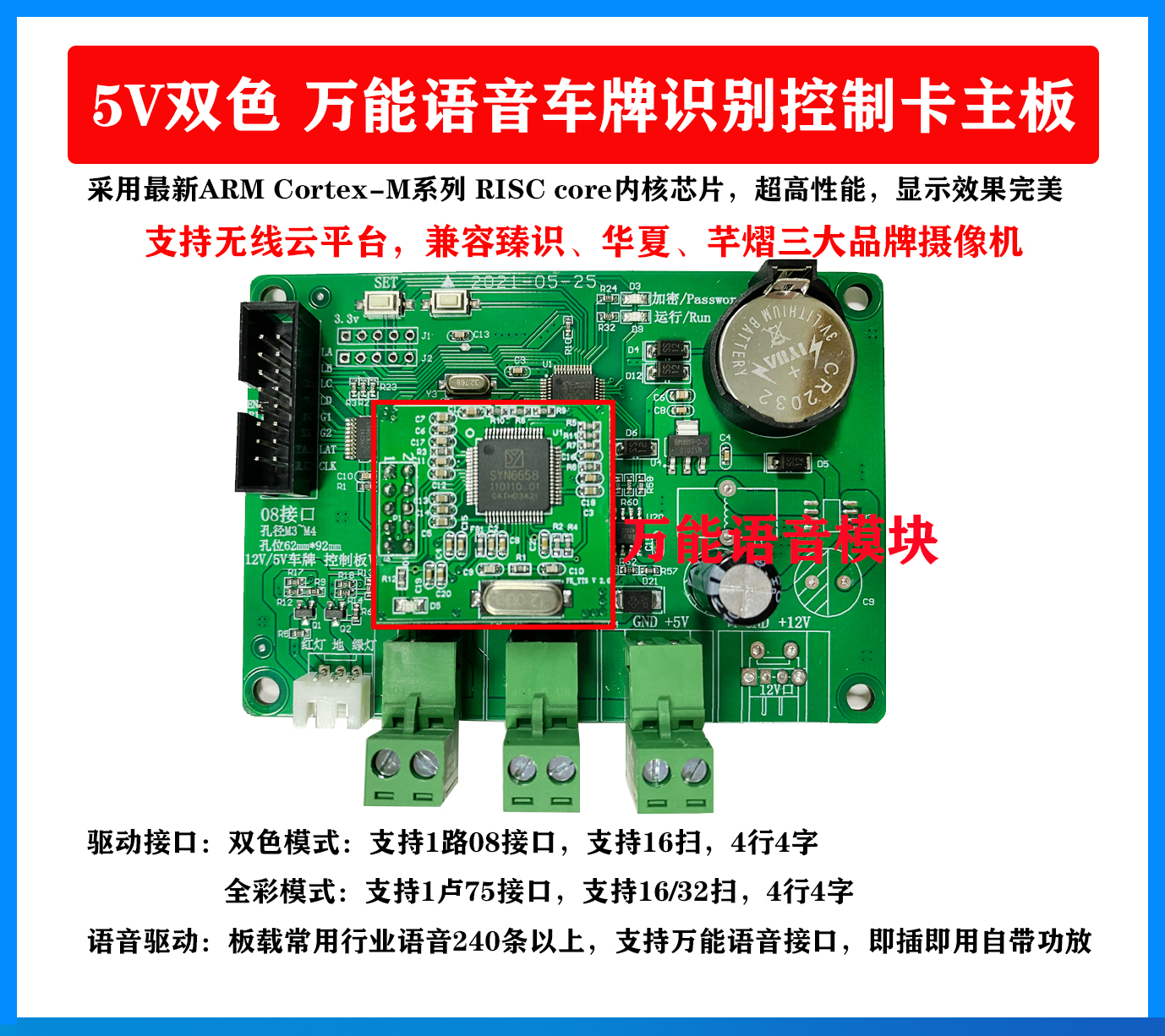 專業(yè)研發(fā)車牌識別語音顯示驅(qū)動(dòng)硬件,提供全方位的技術(shù)支持和定制化的解決方案采用最新ARM Cortex-M4 RISC core內(nèi)核芯片,超高性能,顯示效果完美。 電源接口:5V 100mA,自帶防反接功能通訊接口:標(biāo)準(zhǔn)RS-485通訊,可自定義多種波特率。驅(qū)動(dòng)接口:支持2路08接口,1路75接口支持單色、雙色、全彩顯示效果語音驅(qū)動(dòng):板載常用行業(yè)語音240條以上支持萬能語音自帶功放,支持4~8歐,3